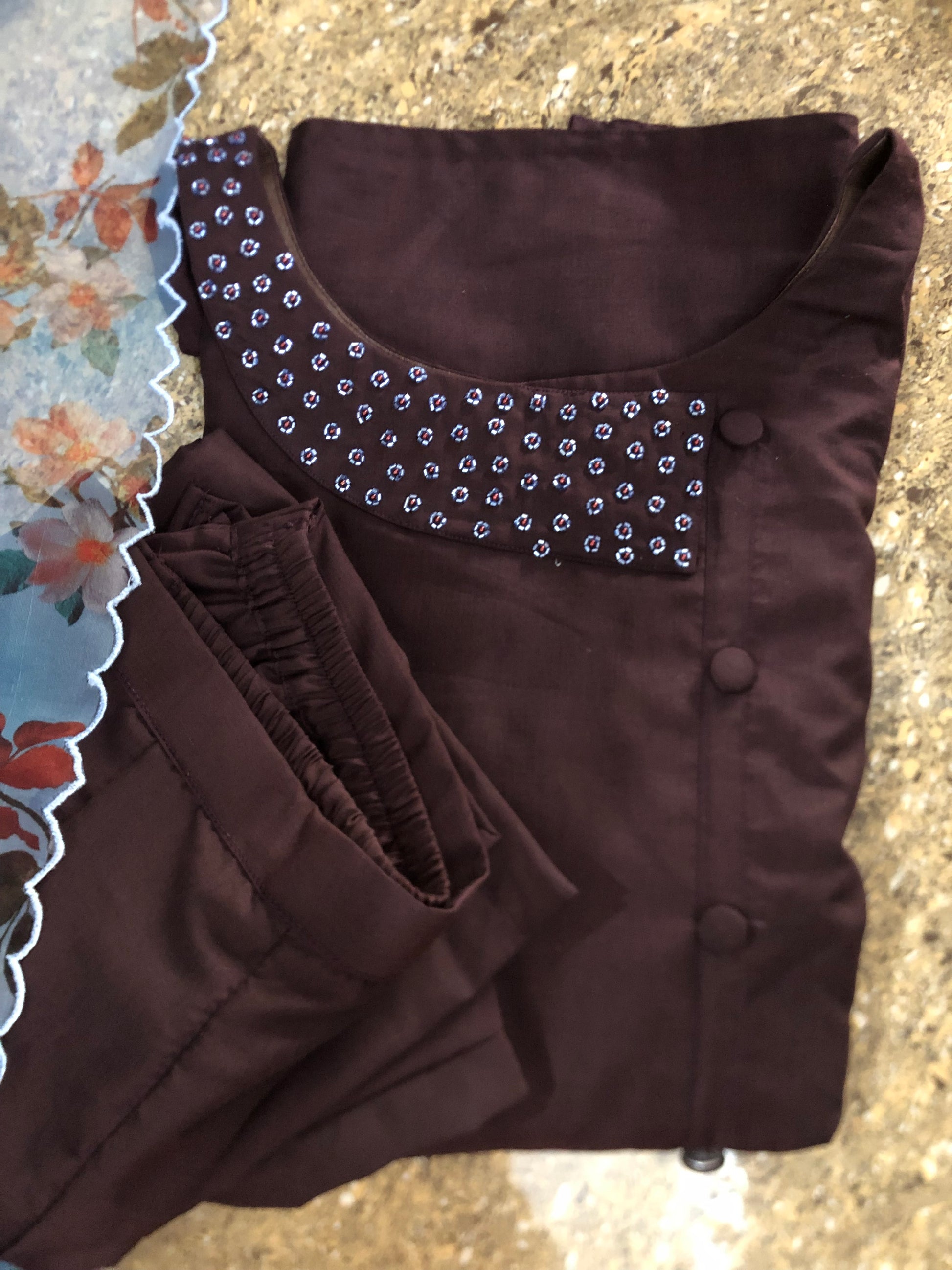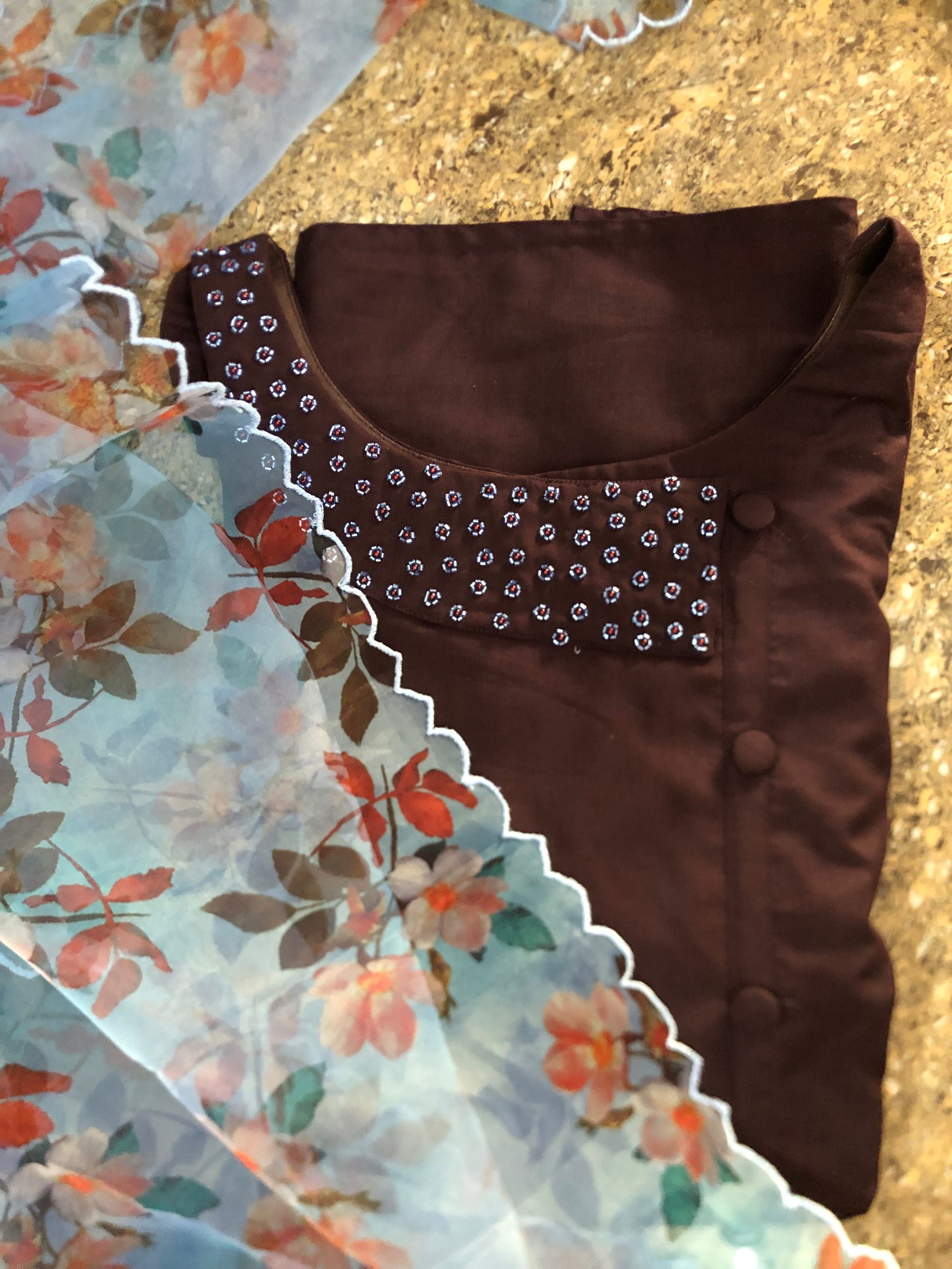 Material : Soft Muslin top, bottom and floral organza dupatta.